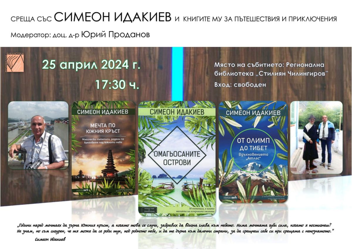 На 25 април, от 17:30 ч. в Регионална библиотека „Стилиян Чилингиров“ гостува известният журналист и пътешественик Симеон Идакиев – човек, еднакво влюбен в красотата на нашата планета Земя и в историята и многообразната култура на света, който обитаваме. Повече от четвърт век Симеон Идакиев е продуцент и водещ на емблематичната географска рубрика „Атлас” на Българската национална телевизия, а след това и към настоящия момент – на предаването „Светът и всичко в него”. Пребродил е над 150 държави на всички континенти и много от знаковите места в България, съхранили безброй природни и сътворени от човека съкровища, а резултатът са близо 500 документални филма, обединени от заглавията „Един мъж, един автомобил, една камера” и „Непознатата България”. В създаването на завладяващи филми за експедиции и приключения, за загадки и древни култури и цивилизации, за екзотични, а нерядко и труднодостъпни географски региони журналистът изпреварва National Geographic и Discovery Channel с цели пет години.