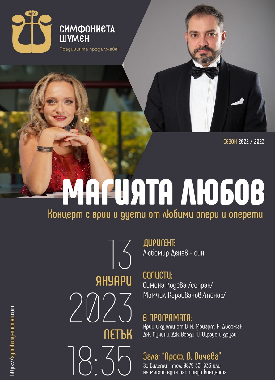 Концертна вечер с арии и дуети от любими опери и оперети ще поднесе на публиката Симфониета – Шумен. На 13 януари (петък), от 18:35 часа на сцената в зала “Професор Венета Вичева”, под диригентската палка на маестро Любомир Денев – син, ще звучат творби на световно известни композитори.