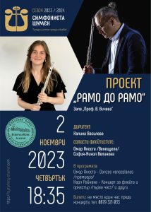 Двама изключителни флейтисти ще споделят сцената, създавайки диалог между опит и изгряващ талант в симфоничния концерт под наслов “Рамо до рамо”. На 2 ноември на сцената в зала “Проф. Венета Вичева” ще блесне таланта на забележителния венецуелски флейстист и композитор Омар Акоста и възпитаничката на Националното музикално училище София Никол-Велинова. Началото на концерта е от 18:35 часа. Програмата включва творби от Елгар, Райнеке и Омар Акоста. Музикалната вечер е част от проект на Симфониета – Шумен, в партньорство с фондация „Европейска музикална академия“ (ЕМА).