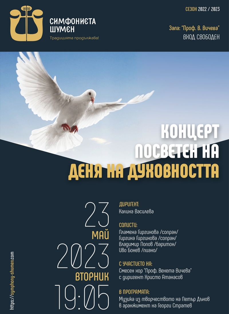 В навечерието на един от най-светлите български празници Симфониета – Шумен ще изнесе концерт, посветен на Деня на духовността. В програмата ще бъдат изпълнени произведения от творчеството на Петър Дънов в аранжимент на Георги Стратев. Под диригентството на Калина Василева в зала “Професор Венета Вичева” ще прозвучат изпълнения на солистите Пламена Гиргинова (сопран), Гиргина Гиргинова (сопран), Владимир Попов (баритон), Иво Бонев (пиано) и смесен хор „Проф. Венета Вичева“ с диригент Христо Атанасов.