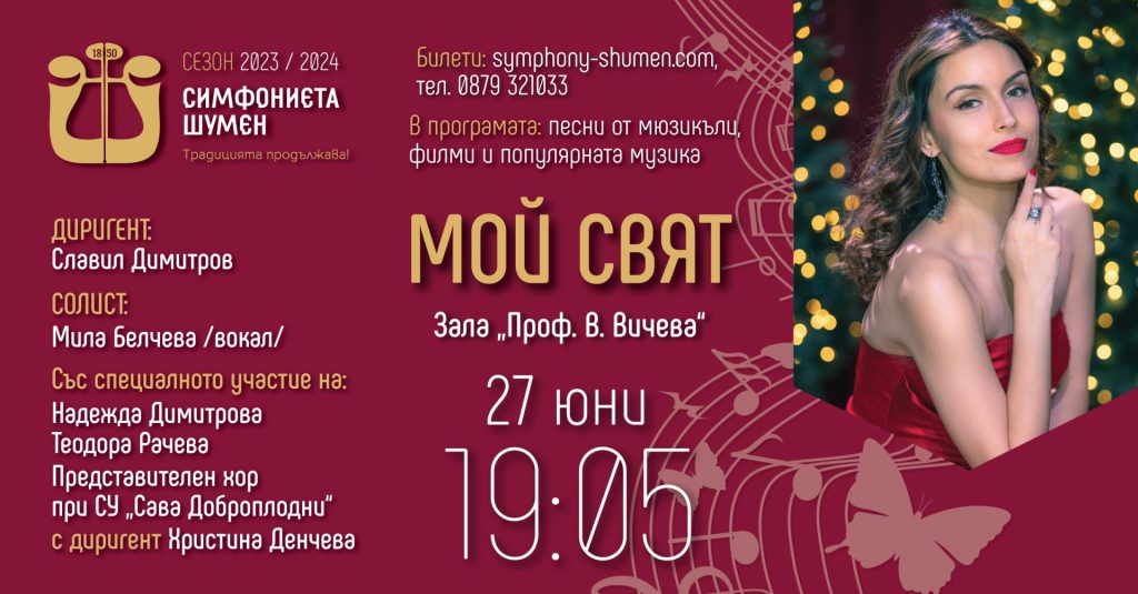 Концертът “Мой свят” ще се проведе на 27 юни, четвъртък, от 19:05 часа в зала “Проф. Венета Вичева”.