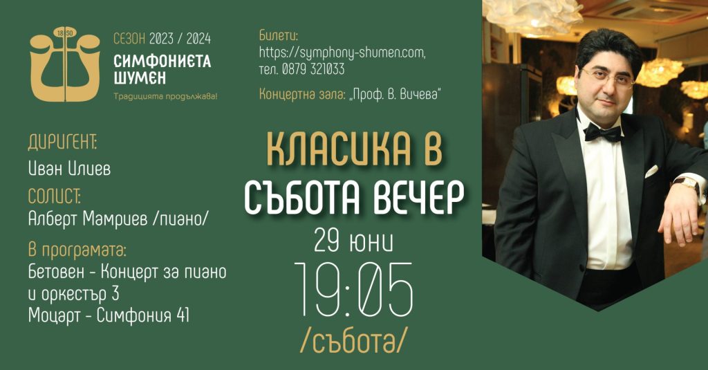 “Класика в събота вечер” среща любителите класическата музика с пианиста Алберт Мамриев, който пристига от Германия. Прочут музикант и лауреат на множество международни конкурси, Мамриев ще изпълни Третия концерт за пиано и оркестър от Бетовен. Финален акорд поставя последната завършена симфония от Моцарт, наричана “Юпитер” заради своята космическа възвишеност. Диригент на концерта “Класика в събота вечер” е Иван Илиев. Началото отново е 19:05, а мястото – зала “Проф. Венета Вичева”.