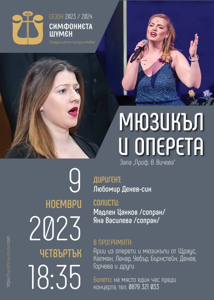 Концертът “Мюзикъл и оперета“ ще бъде воден от главния диригент на шуменската Симфониета Любомир Денев-син. Ще звучат завладяващи мелодии на известни световни композитори и на съвременни български автори. Програмата включва композиции на Щраус, Калман, Бърнстейн, Уебър, произведения на Емелина Горчева-Димова и Любомир Денев. Началото на музикалния спектакъл на 9 ноември, четвъртък, е 18:35 часа в зала “Проф. Венета Вичева”. Билетите ще се продават на място един час преди концерта.