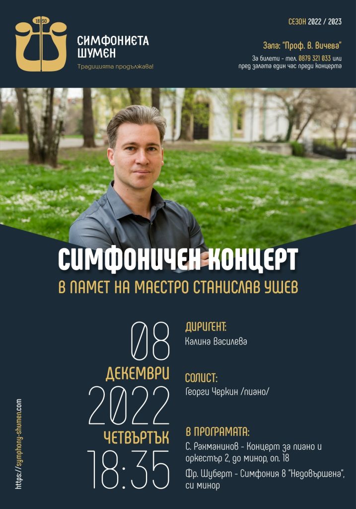 Шуменската Симфониета ще свири в памет на маестро Станислав Ушев. На 7 декември се навършва една година от внезапната кончина на изключителния български диригент и дългогодишен директор на оркестъра. Като директор на Симфониета – Шумен маестро Станислав Ушев води оркестъра повече от четвърт век към нови и все по-големи постижения. Неговият професионализъм, прецизност, ерудираност, школа, етика, правят музиката на класиците да звучи по различен, съвременен начин. Под негово диригентство на шуменска сцена гостуват едни от най-изявените солисти от българската и световната сцени. С любов и загриженост подава ръка на много млади таланти. Във всеки концерт, който дирижира влага огромната си любов към музиката, музикантите, публиката.