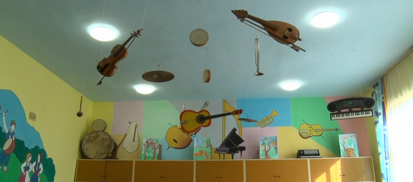 От тавана висят всякакви музикални инструменти, събирани през годините. Инструменти красят мебелите, подредени са и покрай стените. Един от любимите на децата е предшественика на пианото – клавесинът, който е дар от монахините в селото.