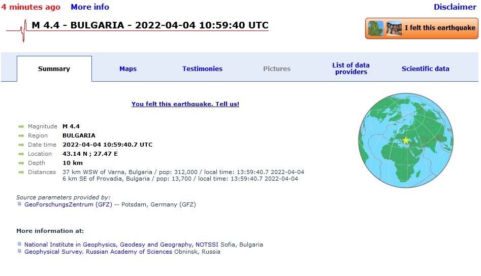 Земетресение със сила 4.4 по Рихтер бе регистрирано на 6 км от Провадия около 14 часа днес. Това сочат данните на Европейския сеизмологичен информационен център. Дълбочината на труса е 10 километра. Много шуменци също са усетили земетресението.