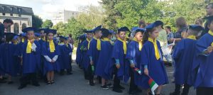 С тържествена церемония детска градина „Братя Грим” изпрати бъдещите първокласници. Облечени в тоги 56 деца преминаха по централната градска част – от площад „Кристал” до паметника в парка до Община Шумен.