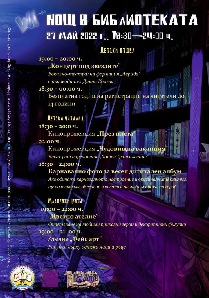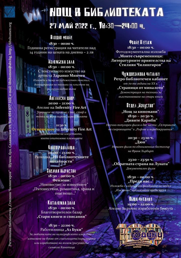 Нощ в библиотеката организира Регионална библиотека „Стилиян Чилингиров” в Шумен на 27 май от 18:30 до 24:00 ч. В Изложбена зала с изложба и базар на художествен текстил и с демонстрация на техники на плъстене на различни видове вълна гостува артистът Здравко Минчев. Във фоайе – II етаж ще е подредена фотодокументалната изложба „Моите съвременници: Литературните приятелства на Стилиян Чилингиров”, изградена върху мемоарите на писателя и разказваща за личните и литературните му приятелства с известни и с по-малко популярни личности от културния и обществения живот на България през първата половина на XX в. Пак на втория етаж, в отдел „Изкуство”, ще е представена изложбата „Преди нас…” с издания от фондовете на отдела, публикувани преди 1922 г.