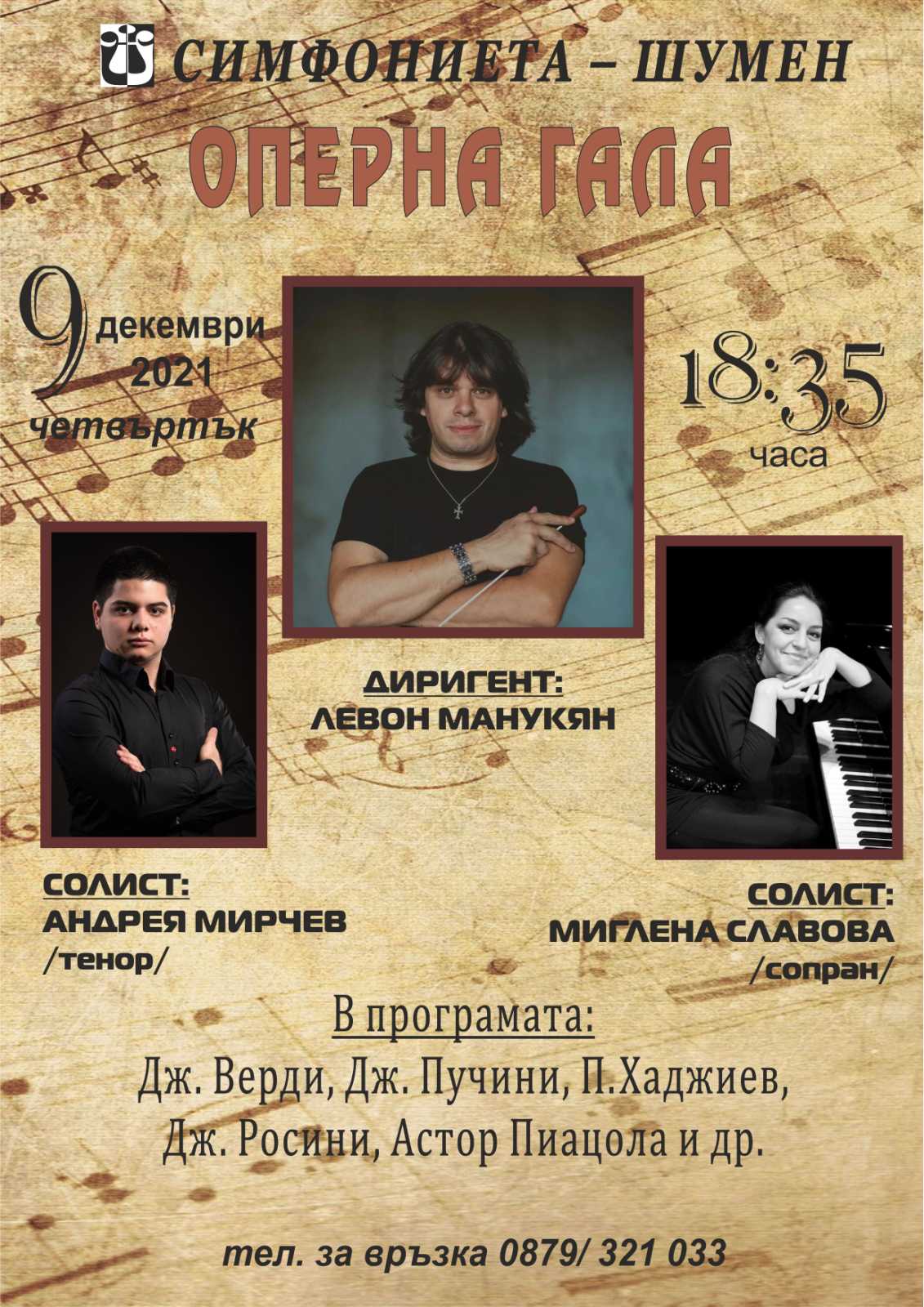 Шуменската симфониета ще подари на своите почитатели концерт с любими арии и дуети. На 9 декември /четвъртък/ от 18.35 часа в зала „Проф. Венета Вичева“ ще прозвучат произведения от великите класици Верди, Пучини, Росини, Пиацола и други. На диригентския пулт застава маестро Левон Манукян. Солисти в програмата са младите и талантливи изпълнители Миглена Славова /сопран/ и Андрея Мирчев /тенор/. Шуменската симфониета кани всички почитатели на класическата музика да се заредят с настроение в празничния декември.