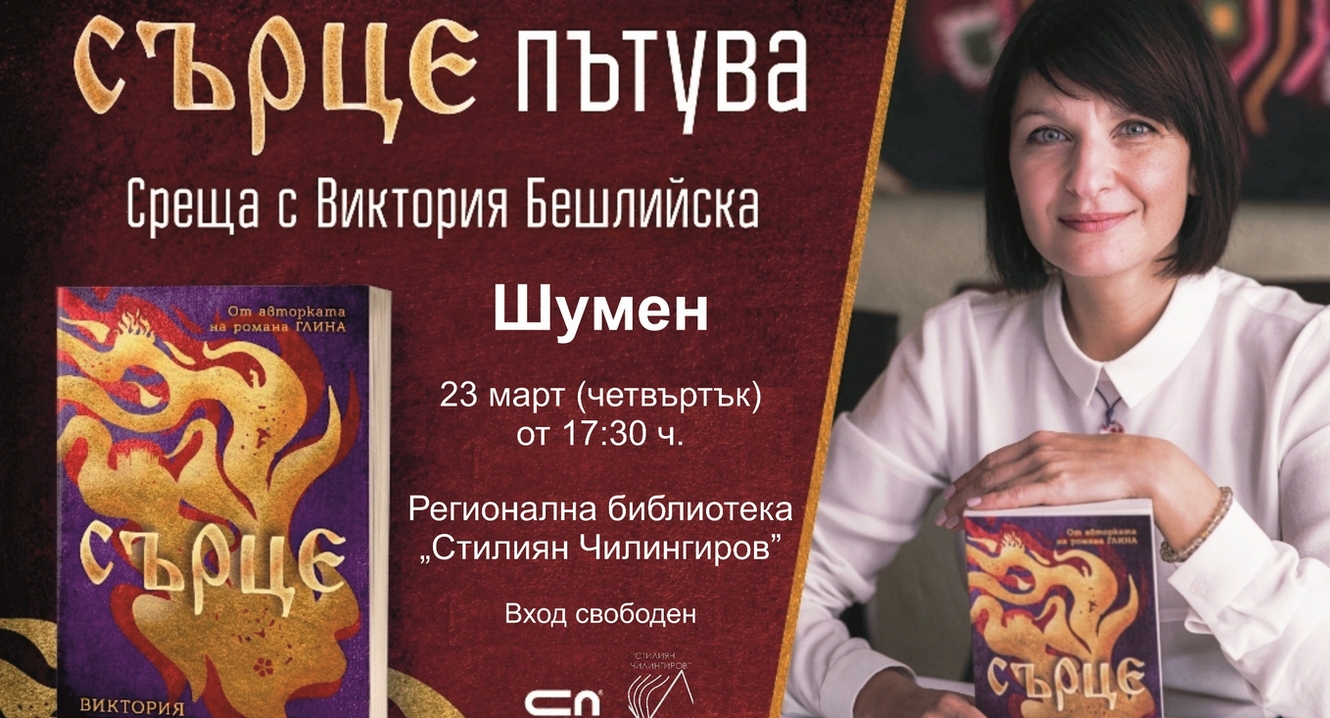 Писателката Виктория Бешлийска ще представи романа си “Сърце” в Шумен. Авторката гостува в шуменската Регионална библиотека „Стилиян Чилингиров” на 23 март, от 17:30 часа.