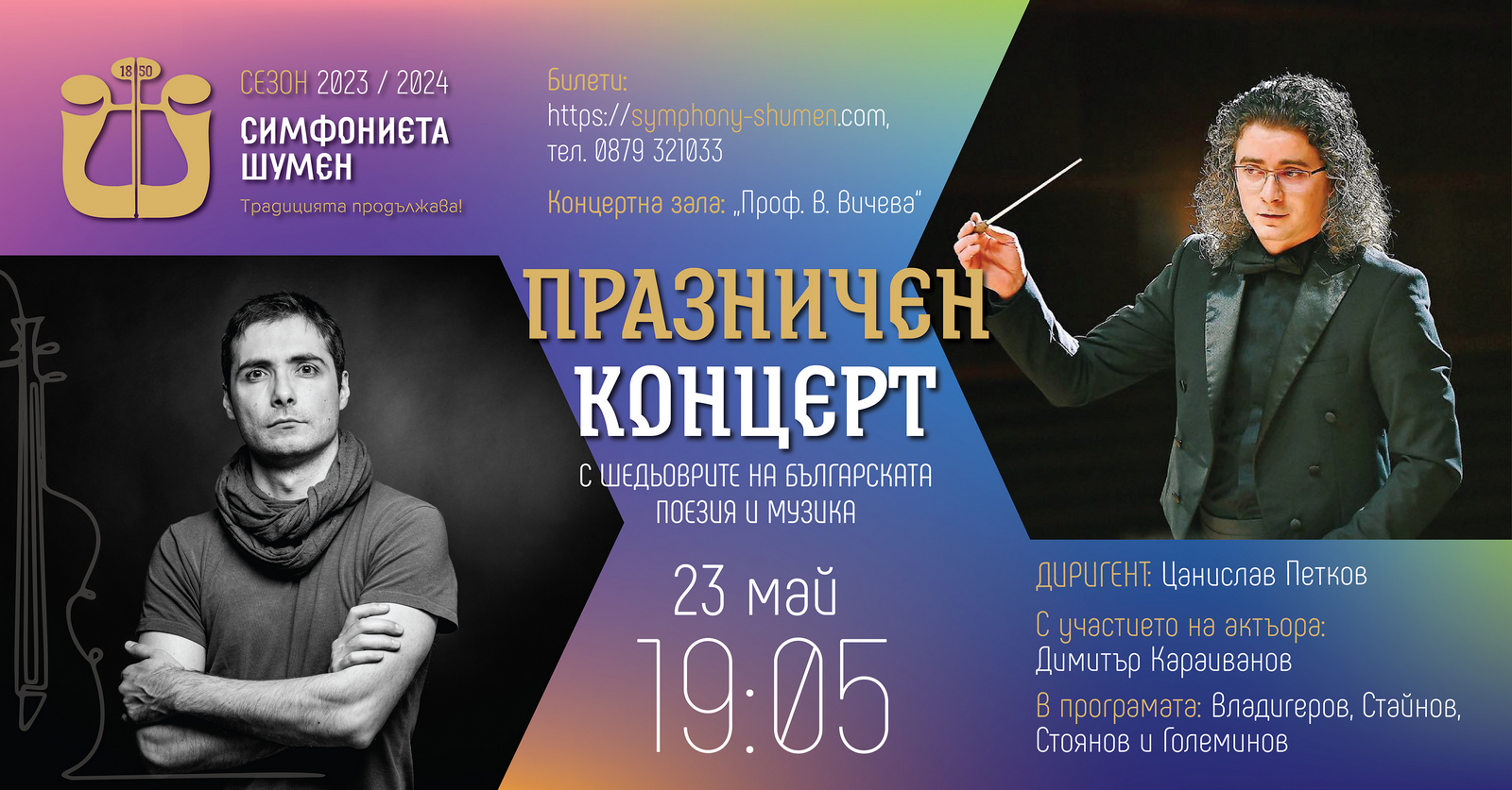 В навечерието на Деня на светите братя Кирил и Методий, на българската азбука, просвета и култура и на славянската книжовност, Симфониета – Шумен почита богатството на българската музика и поезия. Празничният концерт на 23 май започва в 19:05 часа в зала “Проф. Венета Вичева”. Програмата включва произведения от композиторите Панчо Владигеров, Веселин Стоянов и др., както и поезия от Вазов, Ботев, Яворов, Петя Дубарова, Стефан Цанев и други. Актьорът Димитър Караиванов ще вдъхне живот на поезията с акцент върху възхвалата на езика, героизма и любовта.