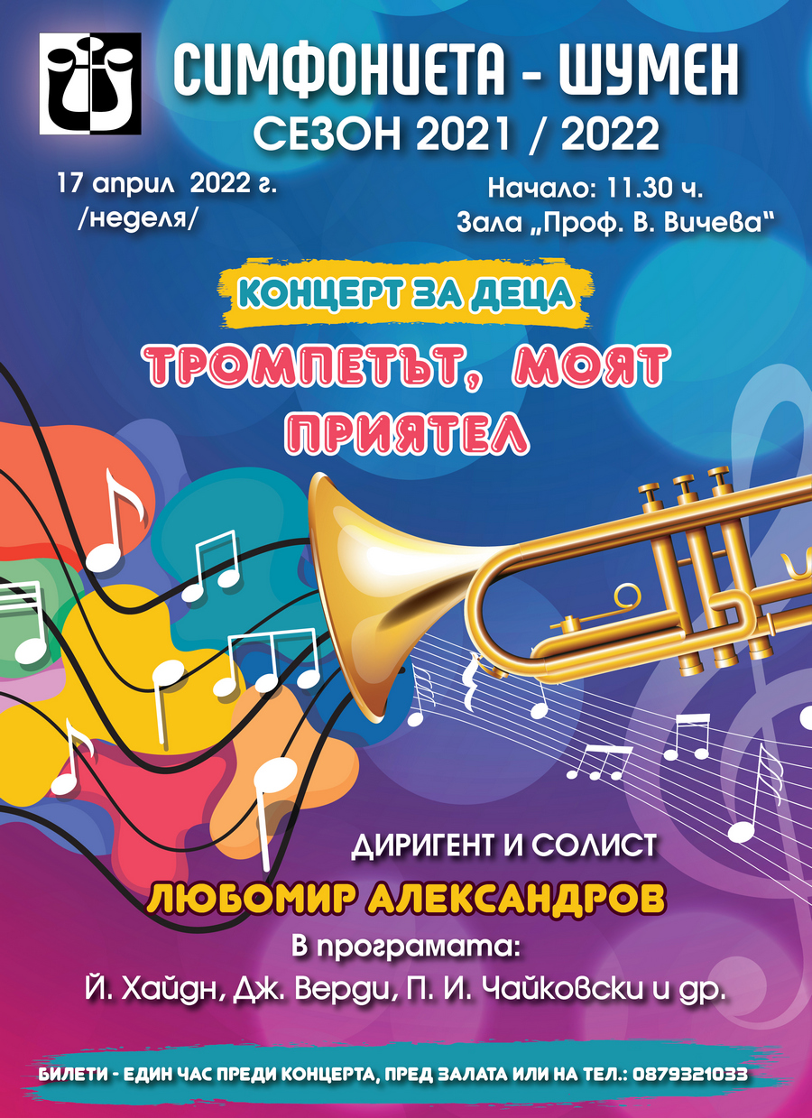 Симфониета – Шумен с вълнение очаква своите малки почитатели на първия концерт за деца през този творчески сезон. Тази неделя (17 април) на сцената на концертна зала “Проф. Венета Вичева” диригентът и солист Любомир Александров ще покаже различните образи на тромпета като инструмент. Началото е от 11.30 часа. В концертната програма “Тромпетът, моят приятел” ще звучат творби на Йозеф Хайдн, Джузепе Верди, Пьотр Илич Чайковски и др. Музикалната среща ще бъде гарнирана и с много изненади.