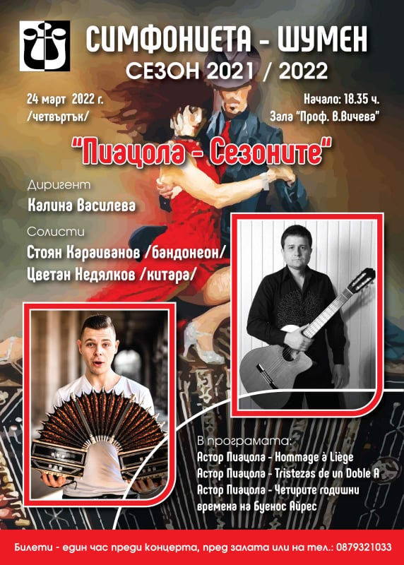 Пролетта идва с гореща танго вечер! Творби на Астор Пиацола ще поднесе на публиката Шуменската Симфониета. Солисти в концертната програма ще бъдат бандонеонистът Стоян Караиванов и китаристът Цветан Недялков. Диригент е маестра маестра Калина Василева. Началото е от 18:35 часа на 24 март (четвъртък) в концертна зала “Проф. Венета Вичева”.