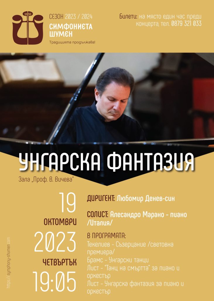 Концертна вечер под наслов “Унгарска фантазия” ще поднесе на ценителите на класиката оркестърът на Симфониета – Шумен. На 19 октомври, четвъртък, под палката на диригента Любомир Денев-син ще прозвучат емблематични творби от Брамс, Лист и Барток. Италианският пианист Алесандро Марано ще концертира на сцената с “Танц на смъртта” от Ференц Лист. Щипка българска музика ще добави творбата „Съзерцание“ от Александър Текелиев, която ще прозвучи за първи път пред публика. Концертът в четвъртък ще започне от 19:05 часа в зала “Проф. Венета Вичева”.