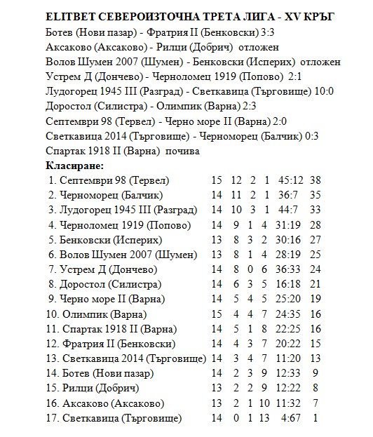 Футболистите на „Ботев“ (Нови пазар) и втория тим на „Фратрия“ (Бенковски) не можаха да се победят в среща от ХV кръг от първенството в Североизточна Трета лига. Двубоят се игра на градския стадион в Каспичан, където домакинства отборът на „Ботев“ (Нови пазар) от началото на сезон 2025/2026. Двубоят завърши 3:3, като в края и двата отбора съжаляваха, че не можаха да стигнат до пълен успех. Гостите от Бенковски, с много млади футболисти в състава, диктуваха играта на футболния терен. Няколко техни атаки още в началото принудиха вратаря Симеон Симеонов да се намесва по-сериозно. Новопазарци в типичният си стил на игра, приемаха съперника в своето игрално поле и при първа възможност контраатакуваха чрез Хакан Шюкрю, Александър Георгиев и Николай Банов. В 22-та минута Стефан Стефанов нахлу в половината на новопазарци, преодоля последователно двама от защитниците на домакините, след което прати топката в мрежата за 0:1. „Ботев“ (Нови пазар) се опита да отговори на предизвикателството, но два непростими пропуска на Хакан Шюкрю оставиха гостите с голово предимство. В 41-та минута Иван Павлов преодоля няколко защитници отдясно и нахлу в наказателното поле на новопазарци. След като финтира и вратаря Симеон Симеонов, подаде към Тодор Колев, който с плътен удар за втори път прати топката в мрежата – 0:2. Последваха три непростими пропуска на новопазарци пред вратата на Владислав Алексеевич. Хакан Шюкрю с глава насочи топката към мрежата, но самоотвержената игра на стража на гостите предотврати тя да влезе във вратата. Минута след това Костадин Йорданов и Йордан Атанасов също пропуснаха от много близко разстояние. В 44-та минута от пряк свободен удар от около 30-35 метра Йордан Банов прати топката директно във вратата на „Фратрия II“ за 1:2.