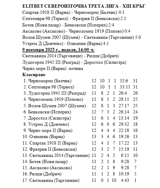 Победата остави тима на „Бенковски“ (Исперих) на шесто място във временното класиране, докато новата загуба на „Ботев“ (Нови пазар) ги остави на незадоволителното 14-о място в компанията на аутсайдерите в групата – „Аксаково“ (Аксаково), „Рилци“ (Добрич) и „Светкавица“ (Търговище).