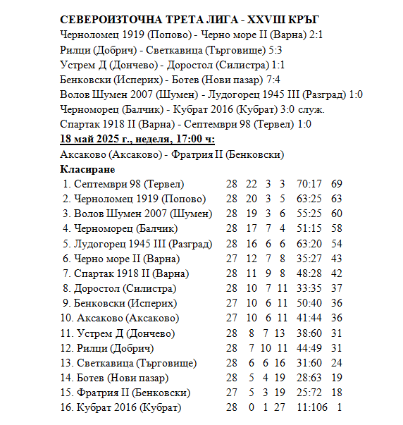В следващия предпоследен кръг „Ботев“ (Нови пазар) приема у дома „Устрем“ (Дончево). Двубоят по програма е на 25 май (неделя) от 18:00 часа.