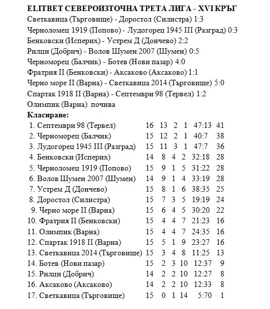 Футболистите на „Ботев“ (Нови пазар) загубиха с 4:0 гостуването на „Черноморец“ (Балчик) в мач от ХVI кръг на Североизточна Трета лига. Домакините са след водачите в групата и поредната им победа над тима от град Нови пазар е напълно заслужена. Двубоят премина под пълното превъзходство на черноморци. Въпреки това обаче1 първият гол в мача падна в 45-таминута, реализиран от Никола Владев след асистенция на Йордан Радев.