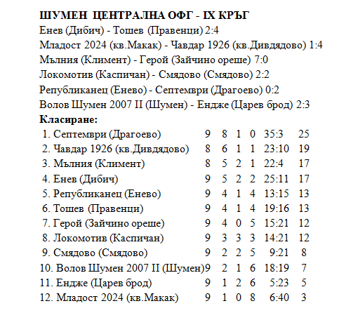 В неделя се изиграха останалите четири двубоя от IX кръг от футболното първенство в Централна ОФГ-Шумен. На Ученическия стадион „Цоньо Василев“ в Шумен на втория тим на „Волов-Шумен 2007” гостува „Ендже” (Царев брод) – до този кръг последен във временното класиране. Играта на изкуствения футболен терен обаче не беше на отбори аутсайдери. Динамична, бърза, с непрестанни атаки и към двете врати. Още в 6-та минута Хасан Хасан от „Ендже“ (Царев брод) от близко разстояние простреля вратата на Дани Минчев за 0:1. Две минути след това Деян Богданов („Волов-Шумен 2007”) след неумела намеса на вратаря на гостите Никола Петров възстанови равенството – 1:1. В 23-та минута гостите от Царев брод спечелиха дузпа, след като техен нападател беше съборен в наказателното поле на домакините. С изпълнението се нагърби Петър Горчев, който не сгреши и даде отново голово предимство на „Ендже” (Царев брод) – 1:2. До края на първото полувреме младите шуменци се надпреварваха – кой повече да сгреши в завършващата фаза на атаката пред вратата на гостите. Многото пропуски оставиха резултата непроменен – 1:2. Освен това в края на първата част Деян Богданов („Волов-Шумен 2007”) получи директен червен картон, след като хвана с ръце нападателя на гостите Симеон Руменов, устремил се сам срещу вратаря Дани Минчев.