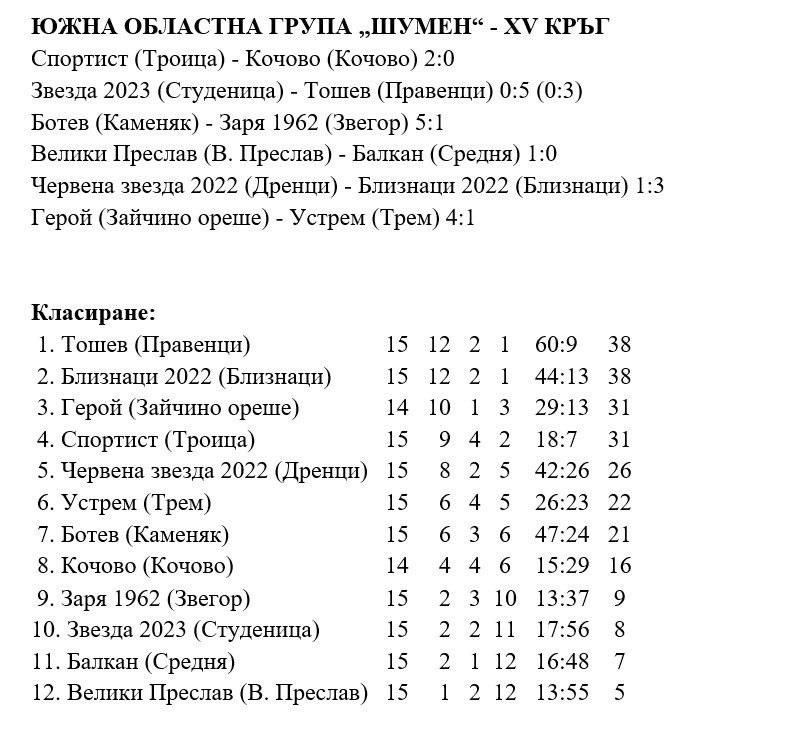 Лидера в групата „Тошев“(Правенци) победи категорично като гост с 0:5 тима на „Звезда“(Студеница). Четири гола във вратата на домакините реализира Мустафа Решат, Ерсим Раим оформи крайното 0:5.