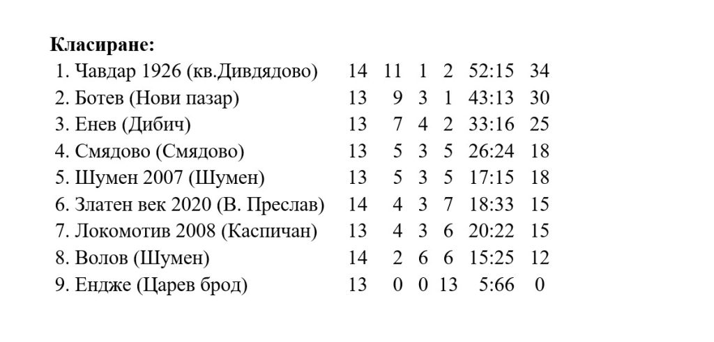 В останалите срещи от кръга лидера „Чавдар“(Дивдядово) победи с 3:1 гостите от „Волов“(Шумен) с головете на Асен Гайдарджиев (2) и Жулиен Жечев. В края на мача младите шуменци реализираха поне гола на честа за крайното 3:1.