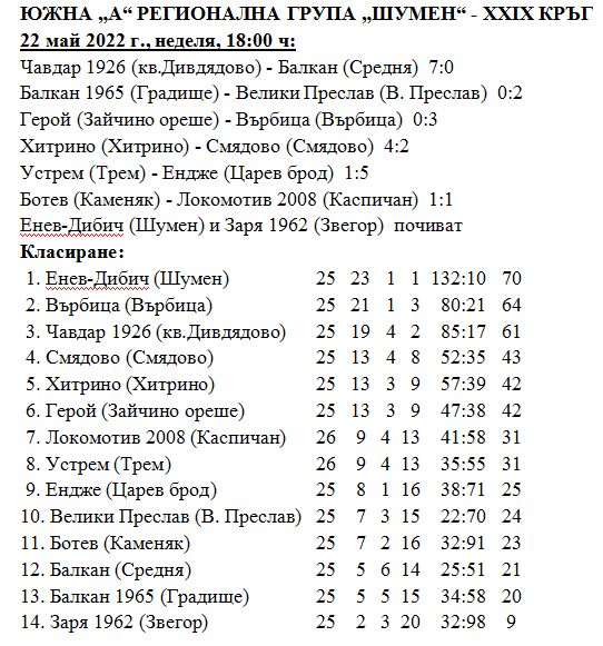 В неделя се играха срещите от предпоследния ХХIX-ти кръг от футболното първенство в Южна „А“ Регионална група „Шумен“. Всички въпросителни относно вторият участник на финалите паднаха. Победата на „Върбица“ в Зайчино ореше ги направи финалисти. Това обаче не стана лесно. След равностойно първо полувреме с пропуски и пред двете врати двата отбора се прибраха на почивката при нулево равенство. През втората част гостите от Върбица използваха изгодните си за гол ситуации и с двете попадения – на Али Йозканов и едно на Ерджан Онбашиев, спечелиха промоцията да играят след две седмици на финалите за 3 – 4 място срещу тима на „Устрем“ (Пет могили) – втори в Северна „А“ Регионална група „Шумен“. Другият претендент „Чавдар“ (кв.