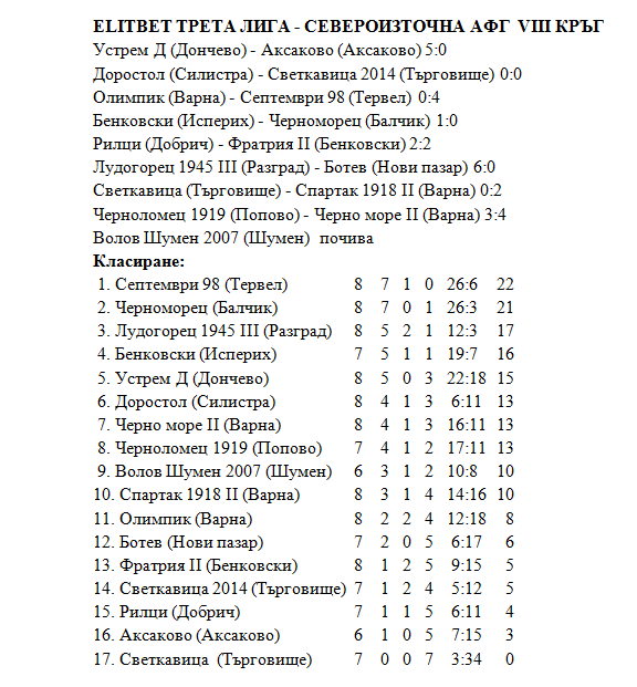 Тимът на „Ботев“ (Нови пазар) гостува в неделя на третият тим на „Лудогорец“ 1945 (Разград) в среща от VIII кръг на Elitbet Трета лига – Североизточна аматьорска футболна група. Двубоят премина под пълното превъзходство на младите разградски орли, които успяха шест пъти да превземат вратата на Симеон Симеонов. Новопазарци успяваха да задържат топката във владение, но атаките им към вратата на Валентин Валентинов бяха хаотични. За разлика от тях бързите млади нападатели на домакините бяха неудържими на футболния терен в спортния комплекс „Гнездо на орли“. Капитанът на младите разградски орлета Мартин Станчев реализира хеттрик. Другите попадения бяха дело на Константин Димитров и влезлите като резерви Петър Люцканов и Янко Ажлани. Загубата остави тима на „Ботев“ (Нови пазар) на дванадесета позиция във временното класиране с шест точки и голова разлика 6:17.