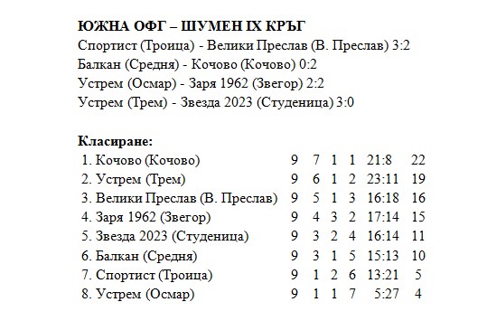 В петък се играха срещите от поредният IX кръг от футболното първенство в Южна ОФГ – Шумен. Лидерът в групата – едноименният тим на село Кочово, гостува на „Балкан“ (Средня) и в един доста динамичен мач спечели трите точки с два гола, реализирани през второто полувреме. Хамза Шефкетов вкара за 0:1, след това Октай Муса от дузпа оформи крайното 0:2. Победата на чужд терен остави тима на върха в групата със спечелените 22 точки.