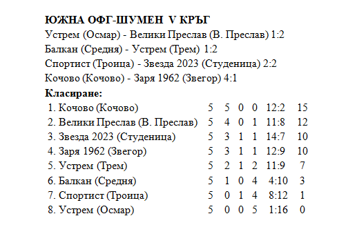 В събота и неделя се играха поредните срещи от V кръг на футболното първенство в Южна ОФГ-Шумен. Получените резултати оформиха временното класиране в групата. Лидерът „Кочово“ (Кочово) прие като домакин успешно представящия се тим „Заря“ (Звегор) и го победи с категоричното 4:1. Два от головете паднаха през първата част, останалите – през втората. Даниел Недков реализира хеттрик, другото попадение за домакините реализира Окан Муса. В този кръг победа на чужд терен постигна тимът на Велики Преслав при гостуването на „Устрем“ (Осмар). Домакините въпреки, че са последни в класирането, заиграха с голямо желание, като удържаха равенството 1:1 до края на първото полувреме. Нов гол за гостите през второто полувреме прати трите точки актив при тях.