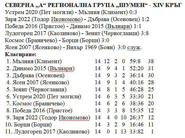 Лидерът „Мълния“ (Климент) спечели гостуването си на „Устрем“ (Пет могили) с класическото 3:0. Головете реализираха Доан Османов през първата част, Фатих Фаик и Межнун Наим – през втората част.