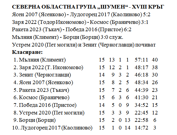 Осемнадесетият кръг от футболното първенство в Северна областна група „Шумен“ даде яснота кои отбори ще представят групата на финалите. Това са „Мълния“ (Климент) и „Заря“ (Тодор Икономово). Разликата от точки със следващите ги отбори е доста голяма и няма как в следващите мачове да бъде стопена. В следващите кръгове престои и директен двубой между „Мълния“ (Климент) и „Заря“ (Тодор Икономово), който ще определи първенеца в групата. В събота и неделя в играните срещите от ХVIII-тия кръг не се получиха изненади.