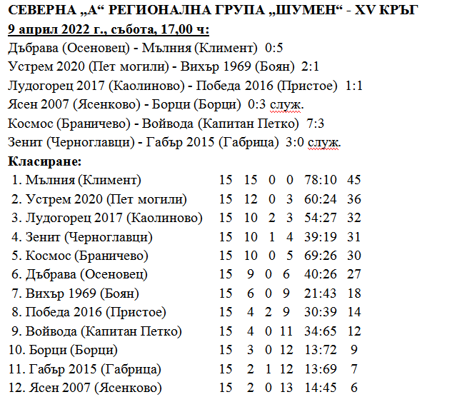 В събота се изиграха футболните срещи от поредния ХV-ти кръг от първенството в Северна „А“ регионална група. Получиха се доста интересни резултати. Лидерът на групата „Мълния“ (Климент) по програма трябваше да гостува на „Дъбрава“ (Осеновец). Двубоят се игра обаче в село Черноглавци защото отбора на „Дъбрава“ (Осеновец) през седмицата получи наказание – лишаване от домакинство за една среща от дисциплинарната комисия към ОС на БФС-Шумен след доклади на длъжностните лица от срещата с „Устрем“ (Пет могили) в предишния кръг. В Черноглавци двубоят премина под пълното превъзходство на гостите от Климент, които в първата част реализираха само един гол дело на Расим Нурханов. През втората част обаче във вратата на символичните домакини от Осеновец паднаха нови четири гола реализирани от Мирослав Петров, Расим Нурханов, Енес Кахриев и Илкер Неджати.