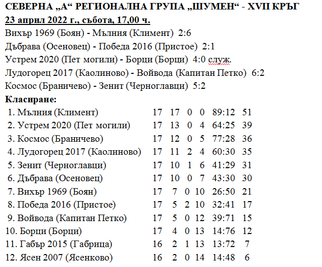 В събота се играха срещите от поредния ХVII-ти кръг от футболното първенство в Северна „А“ Регионална група „Шумен“. Лидерът на групата „Мълния“ (Климент) гостува на „Вихър 1969“ (Боян) и постигна седемнадесетата поредна победа. Двубоят започна вихрено. Още в 3-та минута Меджнун Наим с плътен удар превзе вратата на Ерсин Шабанов – 0:1. След още четири минути игра Мартин Венков удвои преднината на гостите. В 15-та минута домакините намалиха с гола на Алпер Хамдиев и върнаха интригата на футболния терен. Няколко минути след това обаче Расим Нурханов надбяга защитата на „Вихър 1969“ (Боян) и заби топката в мрежата – 1:3. В 30-та минута Желязко Ганчев от тима на гостите записа името си сред голмайсторите в мача, след като беше изведен в наказателното поле на домакините и с плътен удар неспасяемо заби топката във вратата им – 1:4. Пет минути след това за нарушение в наказателното поле на гостите беше отсъдена дузпа, реализирана от Алпер Хамдиев. Минута преди края на първата част Борис Марков също простреля вратата на „Вихър 1968“ (Боян) – 2:5. При този резултат двата отбора се прибраха на почивката между двете полувремена.