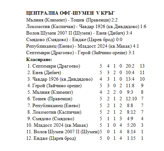 В събота и неделя се изиграха двубоите от поредния V кръг от футболното първенство в Централна ОФГ-Шумен. Три от двубоите бяха през съботния ден и три в неделя. В събота дерби мача между втория тим на „Волов-Шумен 2007“ и „Енев“ (Дибич) беше спечелен драматично от „Енев (Дибич) с головете на Тодор Миленов (2), Иван Тонев от дузпа и Тодор Колев. За шуменци голове във вратата на гостите реализираха Димитър Игнатовски, Диян Миков и Жечко Йорданов – всичките през първото полувреме.