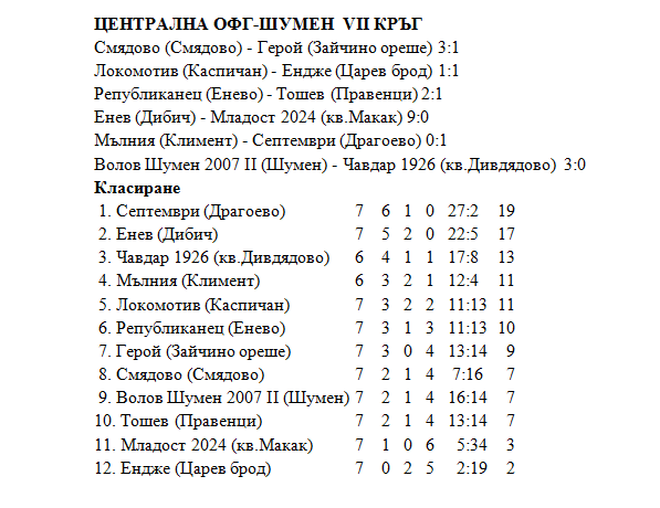 В неделя се изиграха останалите два двубоя от VII кръг на футболното първенство в Централна областна футболна група – Шумен. „Мълния“ (Климент) посрещна на свой терен отбора на „Септември“ (Драгоево). Още в началото се разбра, че двата отбора ще заложат на нападателния си стил на игра. Непрестанните атаки през цялото първо полувреме не доведоха до гол и на почивката футболистите от двама тима се прибраха при резултат 0:0.