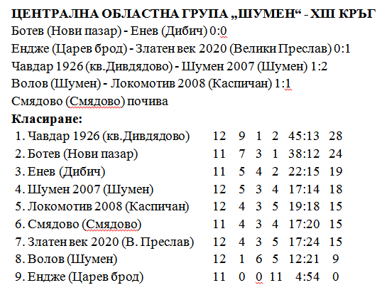 В 15-та минута домакините се възползваха от суматохата на съперниковия отбор в защита и поведоха в резултата. Пет минути преди края на първото полувреме „Шумен 2007“ изравни след плътния удар на Найден Георгиев и асистенцията на Хаджи. След почивката динамичната игра на двата отбора отново зарадва многобройната публика. В 70-та минута централният нападател на „Шумен 2007“ Найден Георгиев вкара нов гол във вратата на „Чавдар“ (Дивдядово). Попадението вдигна на щурм домакините, но пропуските на нападателите остави резултатът непроменен – 1:2. Въпреки загубата у дома „Чавдар“ (Дивдядово) запазва лидерството в групата с натрупаните 28 точки.