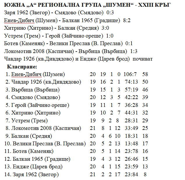 Поредният ХХIII-ти кръг от футболното първенство в Южна „А“ Регионална група „Шумен“ се игра в петък и понеделник. Получиха се доста интересни резултати. В петъчния двубой Смядово надделя като гост над „Заря 1962“ (Звегор) с категоричното 3:0. В ранен мач лидерът „Енев-Дибич“ прегази у дома „Балкан 1965“ (Градище) с 8:2. В първата част домакините реализираха четири попадения във вратата на гостите, още толкава вкараха и през втората част. Гостите от Градище успяха да върнат само два гола през втората част на двубоя, реализирани от Николай Иванов от дузпа, и от Иван Мойсеев.