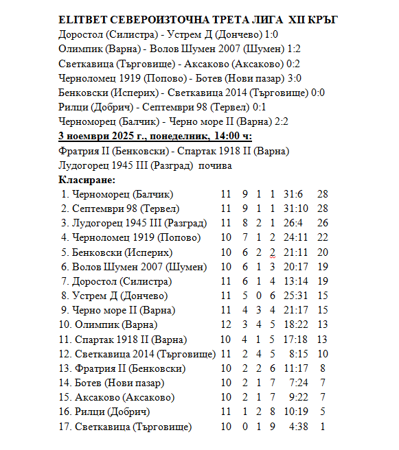 На 5 ноември (сряда) от 14:00 часа е насрочен отложеният от VII кръг мач с „Аксаково“ (Аксаково). В следващия по програма XIII кръг „Волов-Шумен 2007“ ще приеме у дома тима на „Светкавица“ (Търговище). Двубоят е на 8 ноември (събота) от 14:00 часа на стадион „Панайот Волов“ в Шумен.
