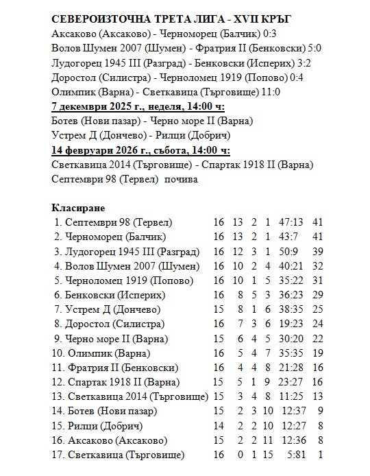 „Волов-Шумен 2007“ победи с категоричното 5:0 втория тим на „Фратрия“ (Бенковски) в мач от ХVII кръг от Североизточна Трета лига. Двубоят се игра при облачно, студено време, като на моменти ръмеше и дъжд. Хлъзгавият терен на стадион „Панайот Волов“ постави на изпитание футболистите на двата отбора, които показаха воля и старание през целия мач. Шуменци наложиха териториално превъзходство още с началото на двубоя. Въпреки това обаче, гол падна във вратата на Владислав Украинский в 40-та минута, след като Боян Димов нанесе воле от близо 25 метра след асистенция на Дилян Миков. Преди това Алекс Наков, Румен Николов, Жечко Йорданов и Димитър Игнатовски пропуснаха да отбележат във вратата на „Фратрия II“ (Бенковски).