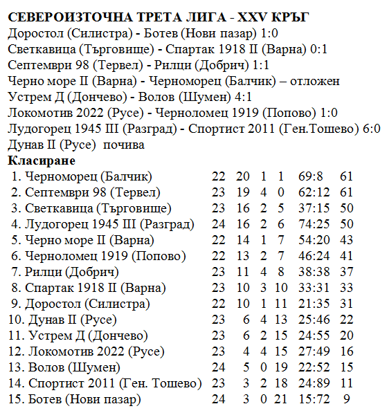 Отборът на „Волов“ (Шумен) загуби с 4:1 гостуването на „Устрем“ (Дончево) в мач от ХХV-тия кръг на Североизточна Трета лига. Двубоят ще се запомни с поредната слаба игра на шуменци, които явно вече са се примирили с незадоволителното си представяне в това първенство. За разлика от тях домакините излязоха на футболния терен доста мобилизирани с една единствена цел – победата. Още в 12-та минута Виктор Христов откри резултата след асистенция на Васко Боев. В 38-та минута отново комбинация между Васко Боев и Виктор Христов завърши с нов гол във вратата на Дилян Димов. До края на първото полувреме по-добрата игра на футболистите на „Устрем“ (Дончево) едва не доведе и до отбелязването на нови голове във вратата на шуменци.