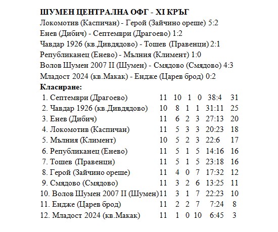В неделя се играха останалите три двубоя от ХI последен кръг за есента от футболното първенство в Централна ОФГ-Шумен. Вторият тим на „Волов-Шумен 2007“ прие на Ученическия стадион „Цоньо Василев“ едноименния тим на град Смядово. Двубоят се очакваше с голям интерес с оглед на класирането в групата. Още в 5-та минута младите шуменци превзеха вратата на Янислав Живков. Разбъркване в наказателното поле на гостите позволи на Валентин Петров от близко разстояние да прати топката в мрежата за 1:0. Три минути след това 14-годишният Едис Тезгюн от пряк свободен удар прати топката директно в мрежата на „Смядово“ – 2:0. В 10-та минута Димитър Пеев също се възползва от разбъркване в наказателното поле на младите шуменци и от близко разстояние намали резултата на 2:1. Три минути след това, отново Едис Тезгюн беше в прегръдките на съотборниците си, вкарвайки нов гол за 3:1.