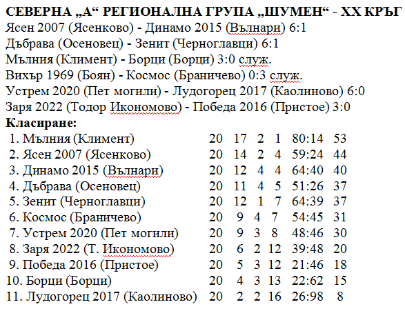 В останалите срещи от кръга лидерът „Мълния“ (Климент) прибави нови три точки без да играе. Гостите от село Борци не се явиха за двубоя и според Наредбата за провеждане на футболните първенства в системата на Българския футболен съюз ще трябва да платят всички разходи по двубоя – съдии, охрана и медицинско лице. Ако това не се случи до следващия мач, ОС на БФС-Шумен вади тима от групата. „Дъбрава“ (Осеновец) прегази гостите от „Зенит“ (Черноглавци) с 6:1. През първата част два гола дадоха предимство на отбора домакин. През втората нови четири гола във вратата на „Зенит“ (Черноглавци) и един във вратата на „Дъбрава“ (Осеновец) оформиха крайното 6:1. Изразителна победа с 6:0 постигнаха футболистите на „Устрем“ (Пет могили) срещу гостите от „Лудогорец“(Каолиново). Четири от головете паднаха през първото полувреме, останалите два – през второто полувреме. Класическа победа с 3:0 постигнаха футболистите на Заря“ (Тодор Икономово) срещу „Победа“ (Пристое). „Космос“ (Браничево) прибави нови три точки след служебната победа от „Вихър“ (Боян), отказал се от участие през пролетният дял от първенството.